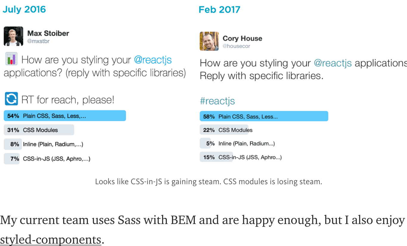 Cory House 的选择编写代码使用SASS,命名使用BEM已经足够,他也关注 styled-components。
