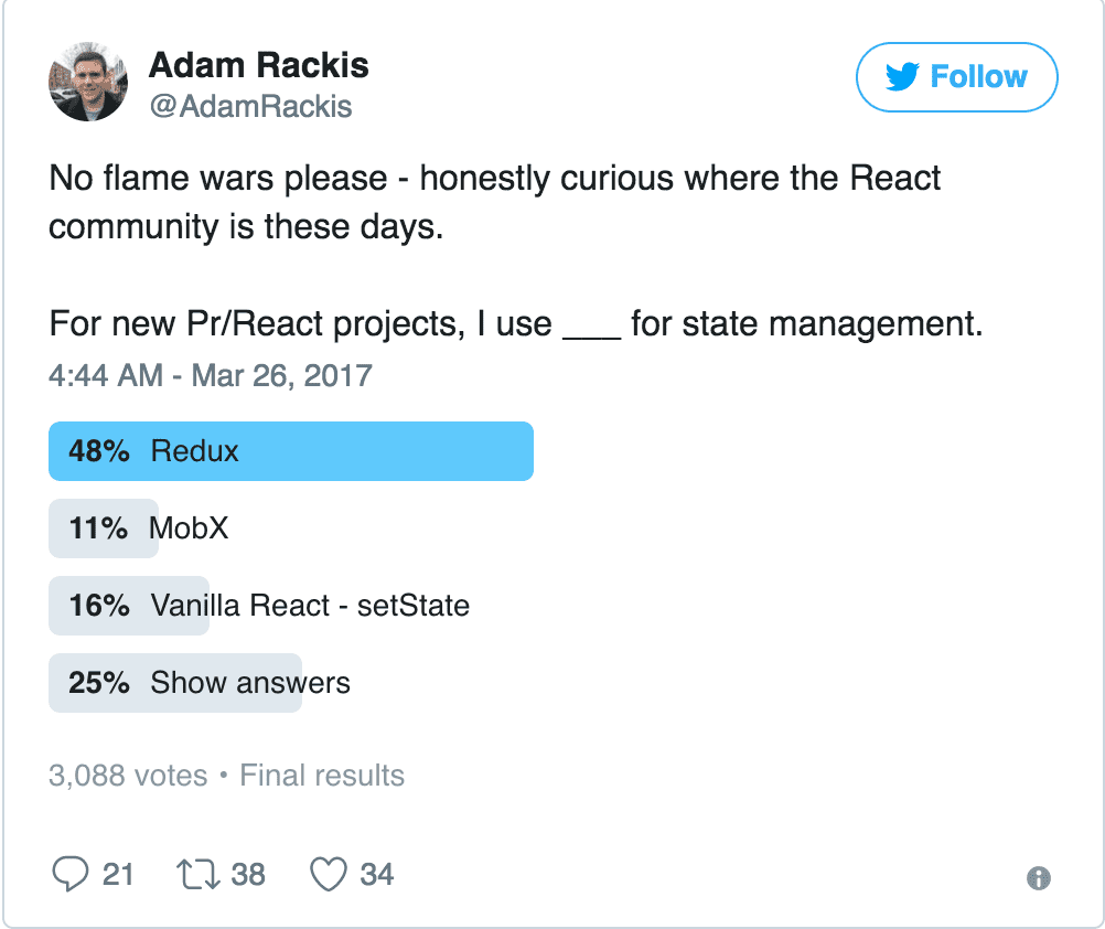 如果是简单WEB的应用,可能 React 提供的 setState() 就完全能满足你的需求,够用就好别强行加入其它 State 管理框架。