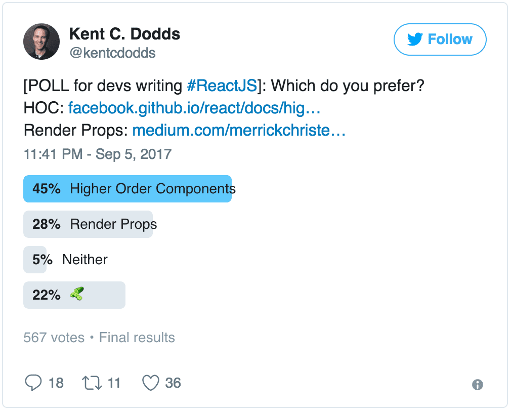 我现在使用的是高级组件,未来也不排除会使用 render props,软件行业不不变的主题就是“变化”,说不定还会有更合理的方案呢?